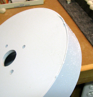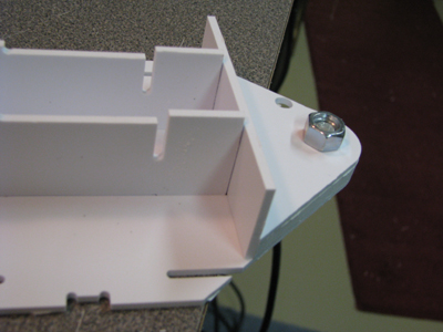 ![]() Inside view of Leg Bottom Plug. If you haven't given any thought about your wiring for the foot drive, take a moment to think about what wires you will need to thread threw that hole. You may want to enlarge it. You can drill it out later if you need to. wires will have to be threaded UP from the bottom of the leg. Left: It's important that the Leg Bottom Plug be tight against the end of the Main Inside Risers. Use a 3/8 Bolt to hold things in place while you test the fit. |