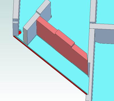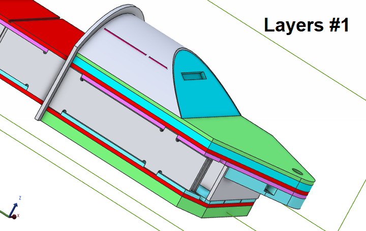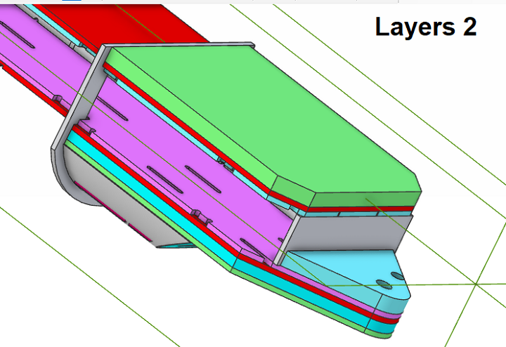| Layers 2 - leg inner side to leg outer side green - was 1/4 + 1/8 - now 3x 1/8 red - 1/8 (large leg outer panel) blue - 1/8 (large leg inner panel) 1 1/4 space for main leg ribs blue - was 1/4 + 1/8 - now 2x 1/8 (with channel inside - compare to above) and 1/8 with access hole on top purple - 1/8 (large leg inner panel) red - 1/8 (large leg outer panel) blue - was 1/4 - now 2x 1/8 green - 1/8 |