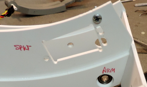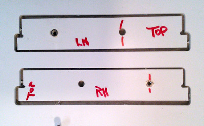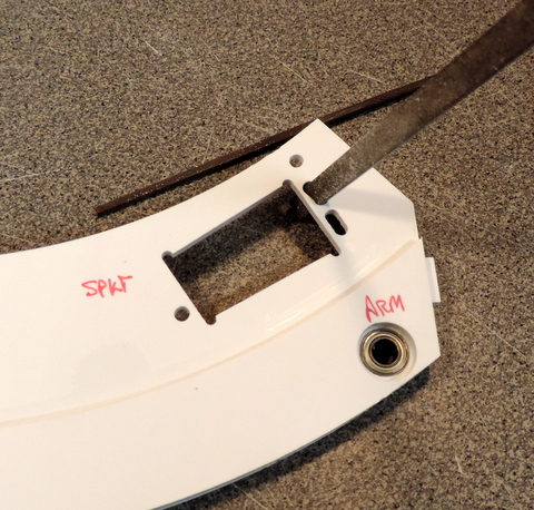 & Right: There's a lot of symmetry in the Arm Box parts. It's convenient to label the center piece where the servos mount with top/bottom designations and also note where the sprocket (top of servo) and body (bottom of servo) will be mounted. Right: take a moment to remove any rough edges in the servo mounting slots. You will only be using one slot, the one closest to the ball bearing, |