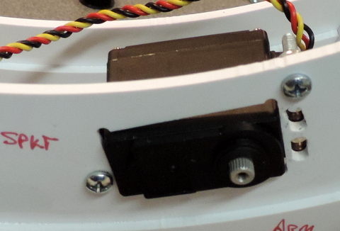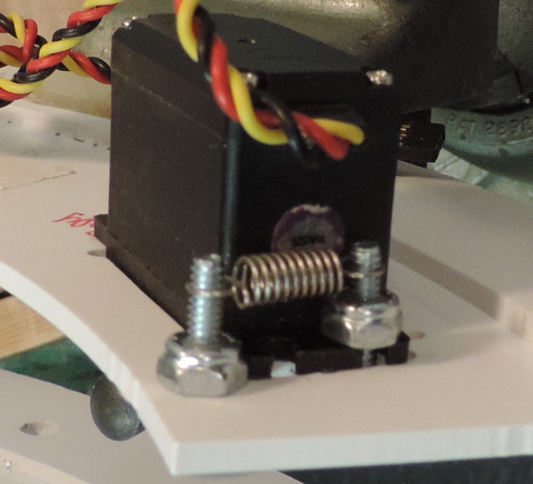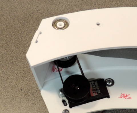 at the end of the spring. Do this step in a location where you'll be able to find the spring if it slips out of the pliers grasp and gets loose. You might want to consider buying extra springs to cover that eventuality. The Screw threads act as natural 'detentes' to hold the spring in place. Not shown: When you have completed mounting your servos, you can attach the MXL sprockets to them. |