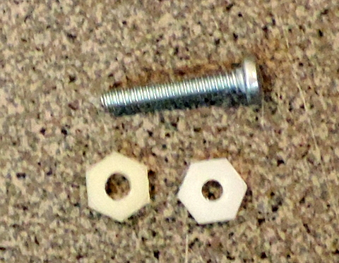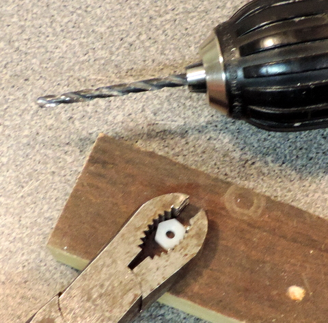 Above: For the final screw you need to modify a #6-32 nylon nut by drilling out the threads. We'll be using it as a low friction pad. Use a #28 drill (#6 clearance). You will need 2, one for each Servo. Right: hold the nut with a pair of pliers. If it 'grabs' on the drill bit it will hurt your fingers! |