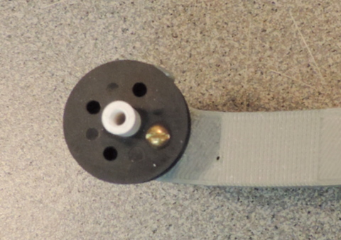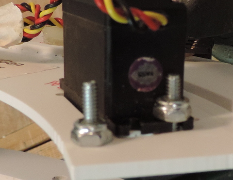 Install a #6-32 x 3/4 screw, with the drilled out nylon nut under the head, in the mounting hole the farthest away from the fixed anchor (the first one you installed). Tighten all the way and then back off ~ 1/4 of a turn. The Servo should pivot freely. |