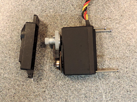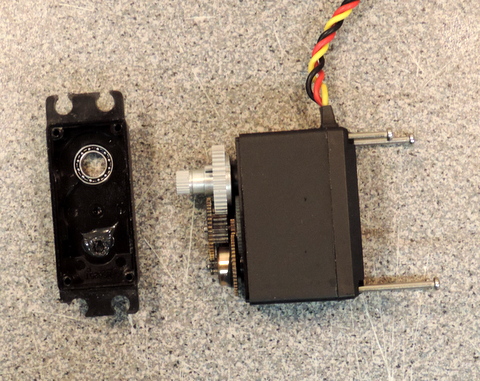 | Servos above: The general assumption is that servos, under normal conditions, are more or less indestructible. When you work on your Arm Boxes, make sure you are over a work surface, this is what can happen when you drop one on the floor! right: if this happens to you, you can get (from Hitec, in any case) replacement case parts to make repairs! |