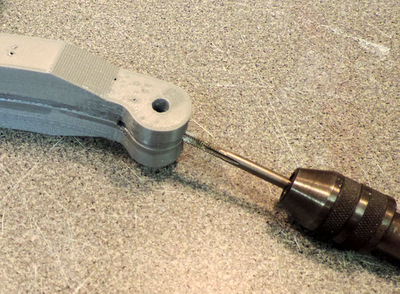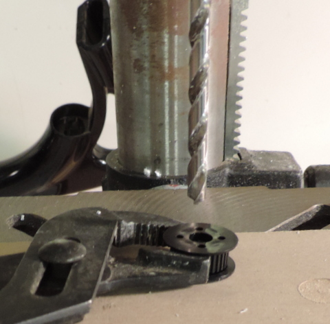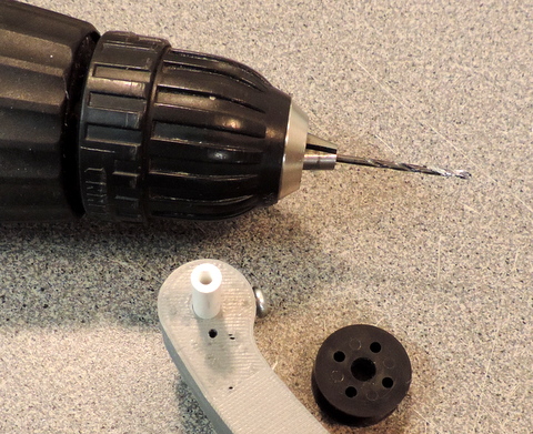 using the sprocket as a guide, drill a hole into the utility arm using a #43 drill (tap drill for a #4 screw) |