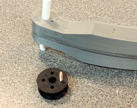 Arms In order to use the MXL sprockets on the Utility Arms you need to drill out the servo mounting hole using a 1/4 in drill. Right: I preferred to do that using my drill press to make sure the hole is square to the sprocket. |
