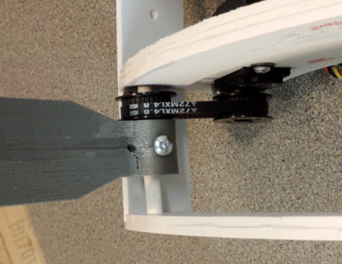 | [7/22/18] The Utility arm motivator project was dormant until I encountered a new product development. Servo City began offering MXL sprockets designed to attach directly to R/C servos. [They offer both Futaba and HiTec versions!]. While I was attempting to 3D print mating sprockets to attach to the Utility Arms my good friend PaulG (aka The Hobby Guy) came up with a more elegant solution! Simply drill out the R/C sprocket with a .25 drill! All that remained to do was to come up with a way to provide tension for the belt drive. What follows is the design that I've worked out, | |