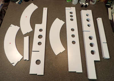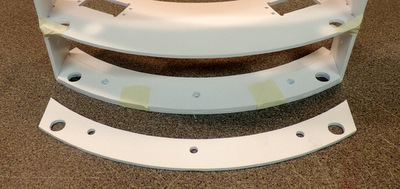 From left to right: Utility Arm Ring Upper & Lower, Utility Arm Box Ribs (2), Rear Door Ring (note no FOD hole), Rear Door Ribs(2), Shoulder Ribs(4), Ankle Slice Ribs(4). Note that the Utility Arm Box Ribs shown here have changed. See Below. |
