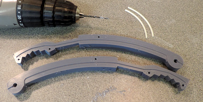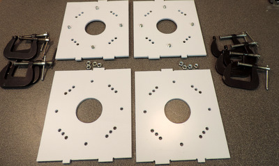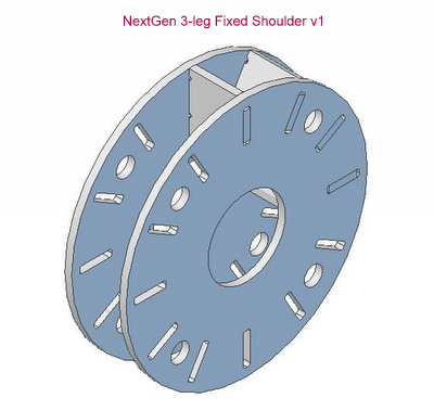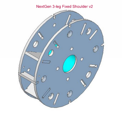 | The shoulder plates you get will not be drilled with full size holes. For hole alignment, to glue the plates together, you can drill the 4 holes that I have used for 1/4 inch bolts (top, bottom, left, right) while assembling the shoulder plates above. The remaining holes (see the parts.pdf drawing) are for: the legacy 3-leg fixed shoulders (the ones at 45 degrees - drill to 1/4 inch) or CS:R style legs (the ones at +/- 36 degrees - drill out to 1/2 inch). For the CS:R legs Do NOT drill out BOTH holes. You only need to drill one set in each shoulder! Drilling both holes could weaken the shoulder plate as they are close together. You might want to wait till the frame is assembled to make sure you drill the correct set of holes! | |