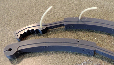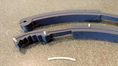Above: these are the skin attachment points. shown above in the Ribs1 panel they are not discussed here in the frame assembly. Right: they are installed in the droid's "armpit" and are used to anchor the end joints of the 1/2 wrap engraved skins. you'll find more information on the web pages that talk about mounting the engraved skins. |
