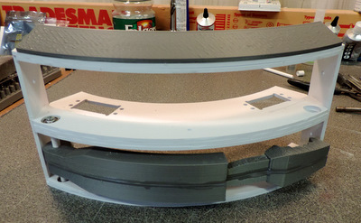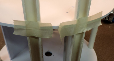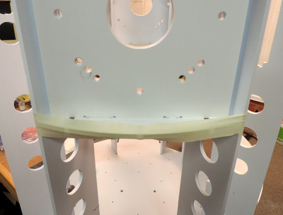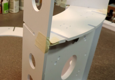 At the front, install the two Utility Arm Ribs. Use tape to hold them in place at the top. |