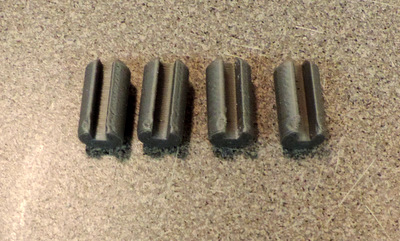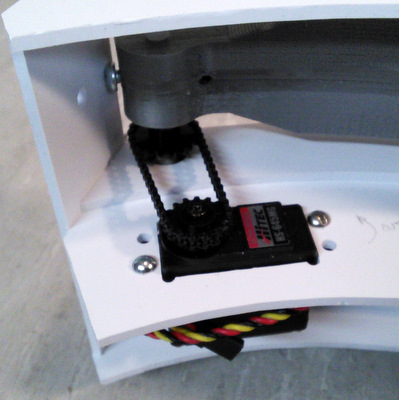 | My original design for the arm motivator called for the use of GT3 timing belt loops. I was going to 3D print utility arms with the GT3 sprocket attached and print a separate sprocket to be attached to one of the servo 'horns' supplied with the servo. It was going to be difficult to attach the sprocket to the horn and then there was still the problem of tensioning the timing belt. I was searching for sprockets, for a different application, when I came across sprockets that could be mounted directly onto a servo from Servo City. They make a line of .1277 in plain bore sprockets, servo sprockets and plastic chain. While SDP-SI also carries .1277 sprockets and chain, they do not have servo mount sprockets. I used an 18 tooth servo socket and a 20 tooth plain bore sprocket on the utility arm shaft (it's a TIGHT fit). It takes less than 6 in of chain to form the loop (it's sold in 1 ft increments). | |