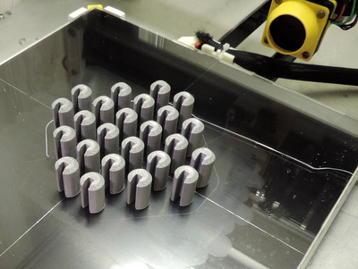 Left: the Sliders on the bed of the 3D printer. Above: sample Sliders |