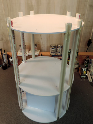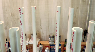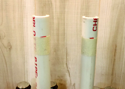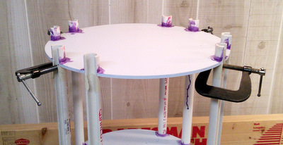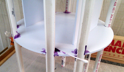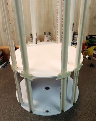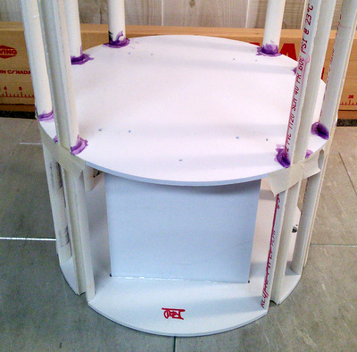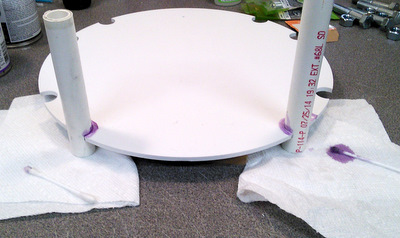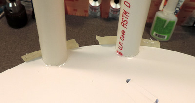 ![]() Above: I tried it out on a spare piece of core using some shorter pieces of pipe. Be careful with the 'purple primer' it will stain just about anything it comes into contact with. Right: as in the earlier assembly, the core is upside down. The flat surface insures the top edges will all be even. The tape keeps the pipe segments from rotating while glue is applied. Note the glass plates. They are to keep the work bench clean. |