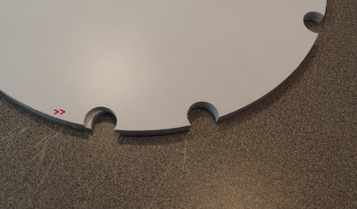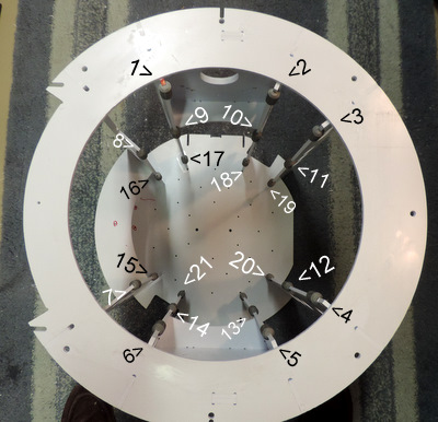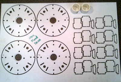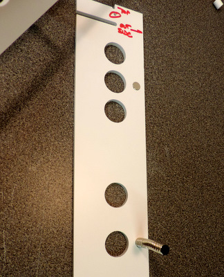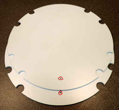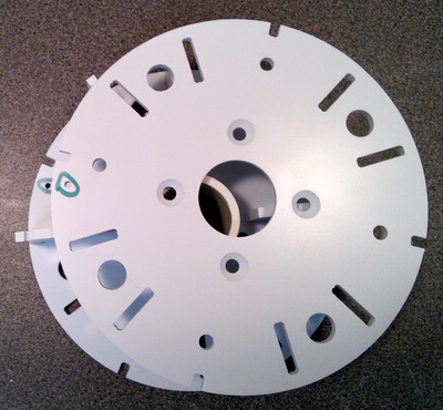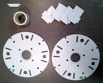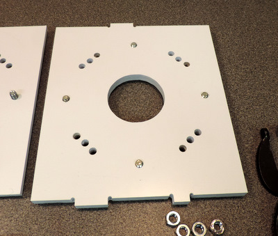 ![]() Above: Parts in the panel plus the 2 pieces of PVC pipe. Right: The left hand pair of hub pieces have been turned over so you can see the countersunk holes. Note the single and double holes (circled) that denote which set the parts belong to. |
