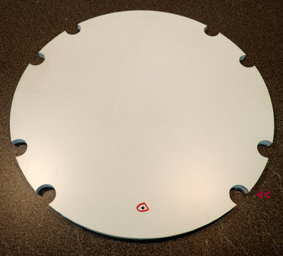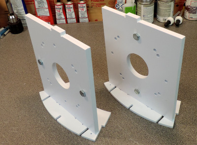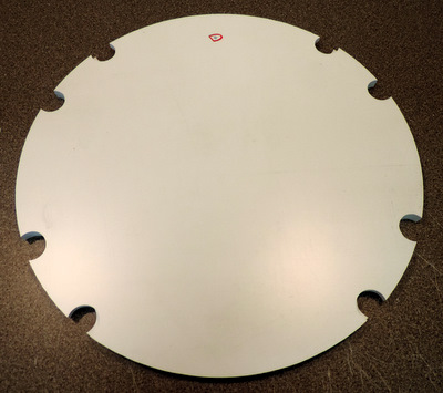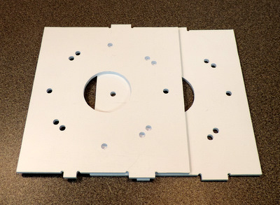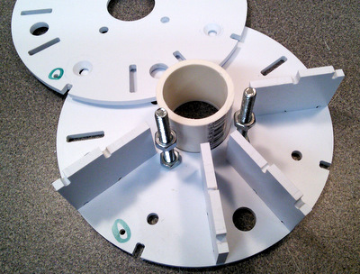 | A Note about the Shoulder Plates shown above. The mounting holes are smaller, 1/8 inch, than what you will see in the assembly pictures. It was done to accommodate CS:R leg specifications that call for 1/2 inch bolts. But those were derived from designs done by builders of aluminum droids. Meanwhile there are lots of builders who used Dave Everett's Styrene Droid Plans. Dave used an entirely different bolt pattern. I chose to leave the decision up to the builder when I reduced the hole sizes. To follow the assembly instructions shown here you can drill out the holes at top/bottom/left/right to 1/4 inch and use 1/4-20 bolts to hold the plates together during dry fit and glue up. Leave drilling the remaining holes to when you are ready to mount legs.For more of the details on mounting legs, jump ahead to the section on Fixed Shoulder Hub assembly. | |