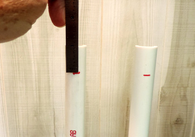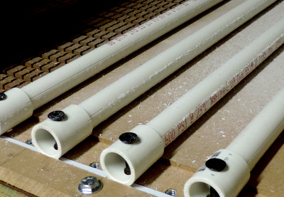 ![]() Working space is tight. Only glue two pieces at a time. I applied the primer and cement using Q-tips. Gently roll the Q-tip so the primer is squeezed out and runs down into the joint. I did 1/2 a pipe at a time then got more primer on the Q-tip for the second 1/2. Do two halves of one application, then do the second pipe. I applied primer twice to each pipe (it evaporates quickly) then followed up immediately with the clear cement. Then move onto the next pair of pipes. When all 8 are glued let the glue harden overnight before going onto the next set of joints. |