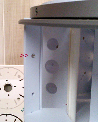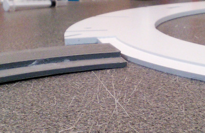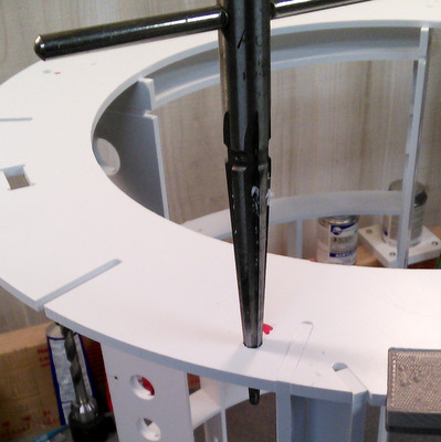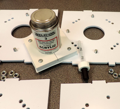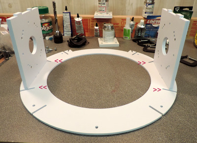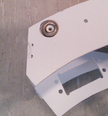 Above: The bearing mount plates with the three holes mount to the top & bottom rings of the arm box (note the matching 3 holes in the arm box top & bottom) Right: file off any excess glue that might be on the inside edges of the joint. It will prevent the bearing rings from bonding to the top/bottom rings. |