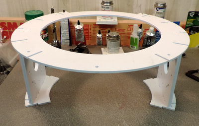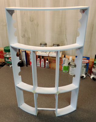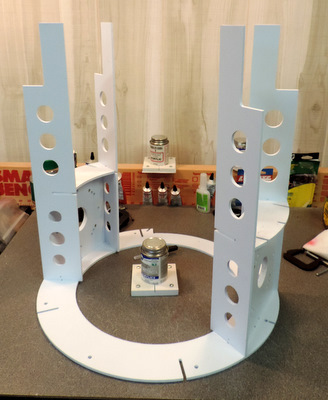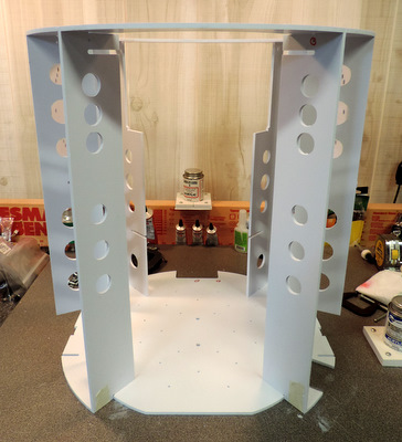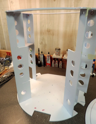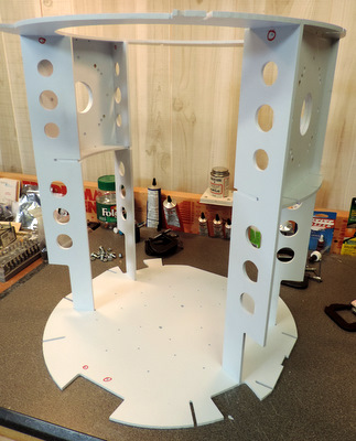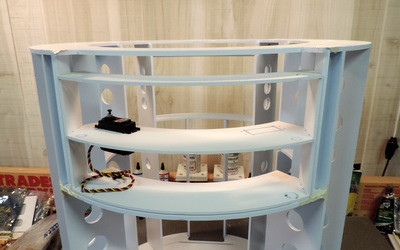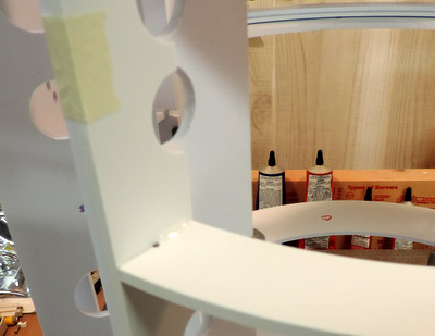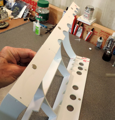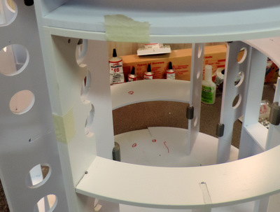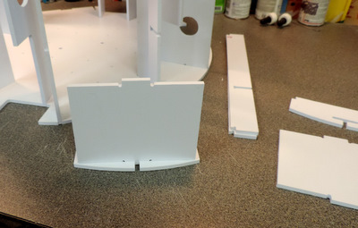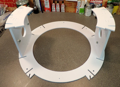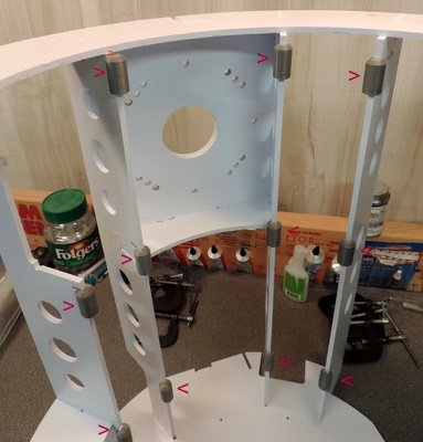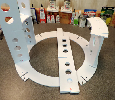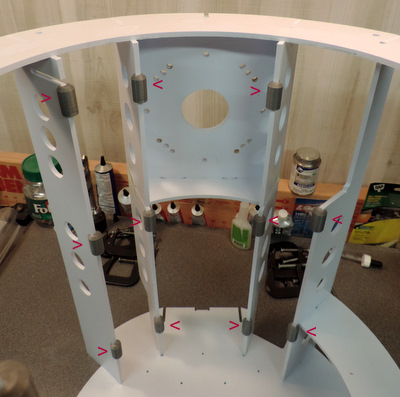 Above: Once the glue dries you can turn the assembly over and add the Under Shoulder Rings (partial) and then glue them in place. Right: turn the frame upside down again and now install the 4 shoulder ribs. Use the Under Shoulder Rings for alignment. |