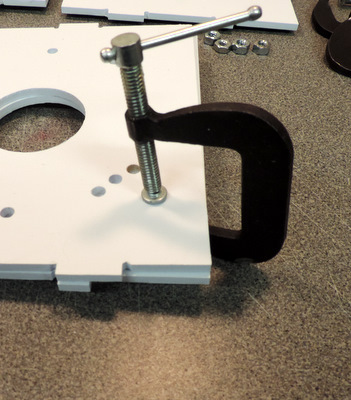 Above: The Weldon #xx glue dries evaporates really quickly. Have your clamps and alignment bolts ready to go before you apply any glue. Right: use 1/4 inch bolts to hold the plates in alignment. |