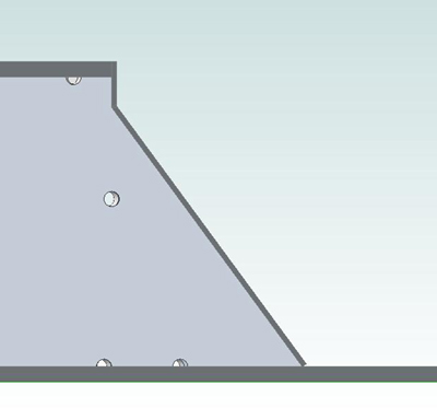 ![]() on the original design the joint between the two edge pieces was unsupported except at a rib location | ![]() in the revised design the short upper piece extends below the angled piece to support it along the whole length of the joint. |