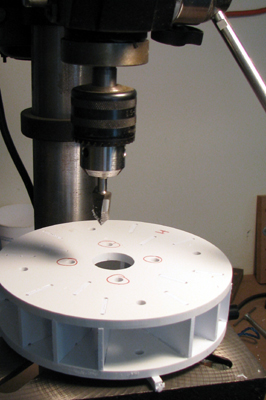 ![]() With the scrap now under the hub, drill out the holes you marked on each side of the hubs. |